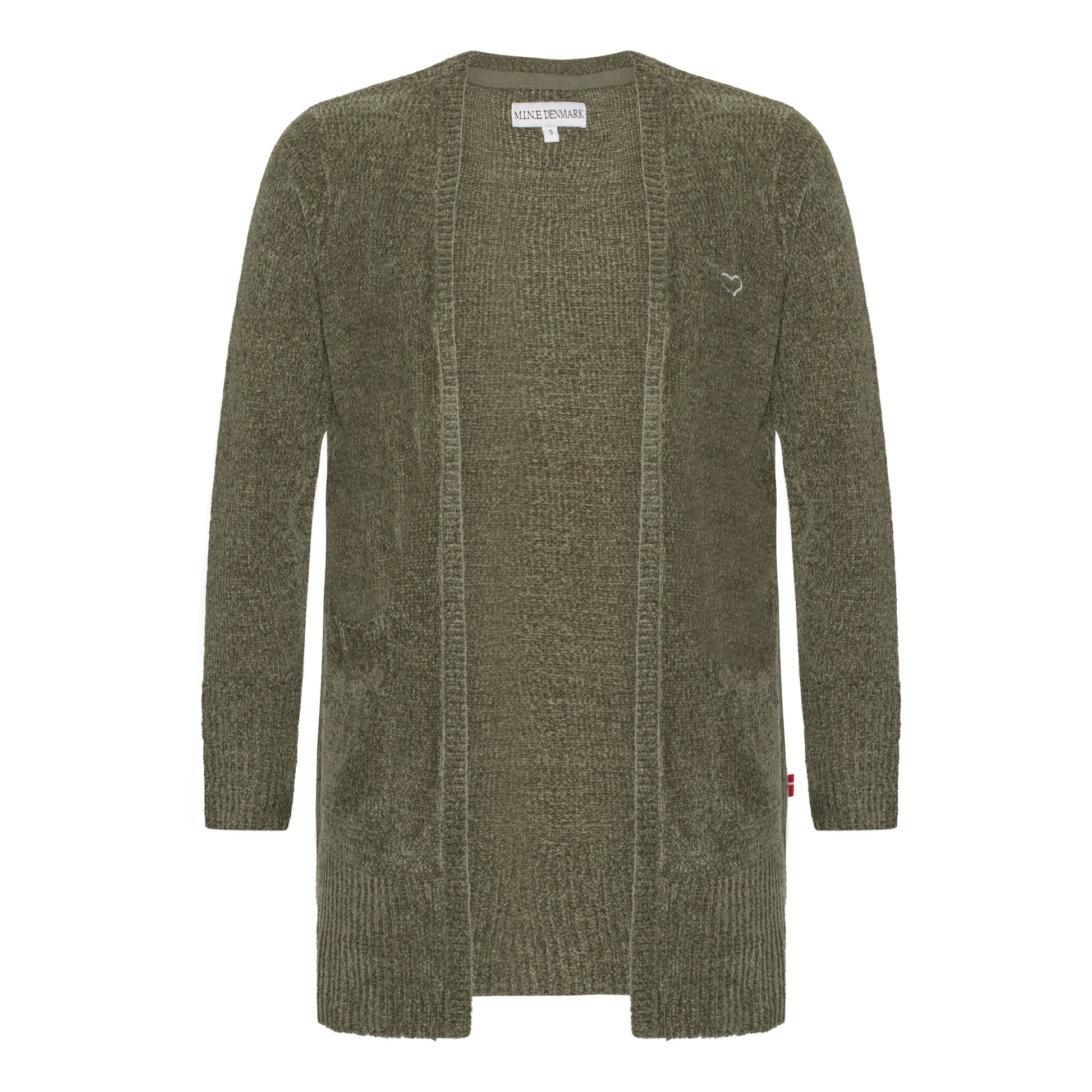 Cardiganen er fremstillet i 100 % akryl chenille, som føles ekstra blød mod huden og giver en luksuriøs fornemmelse. Den har en klassisk, åben front med praktiske lommer og et diskret broderet sølvhjerte på venstre side – en fin detalje, der tilføjer et feminint og personligt touch.
