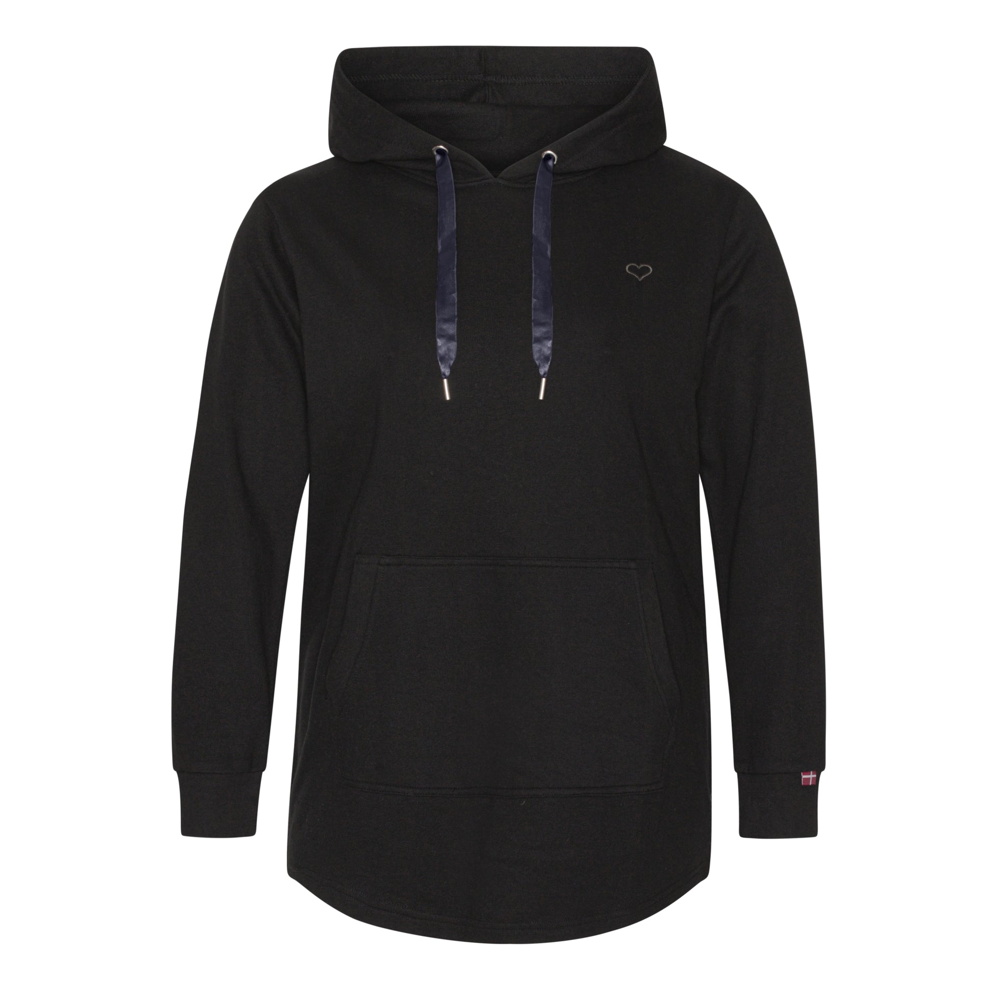 Det stilrene design er kombineret med fine detaljer som et diskret hjertebroderi fortil, satinbånd i hætten og en rummelig kængurulomme til hænder eller småting. Hoodie’en har extra længde og en let afrundet bund, hvilket giver et flatterende fald over hofterne – perfekt til kvinder i størrelse 42–60.